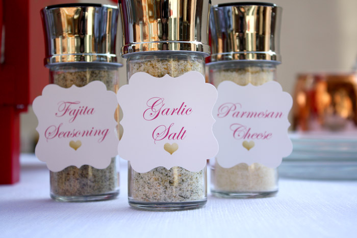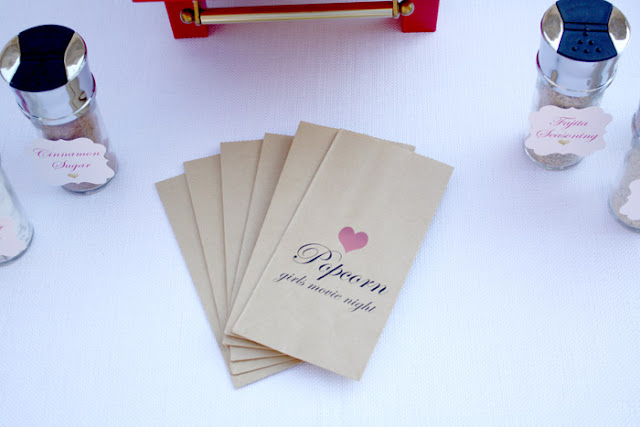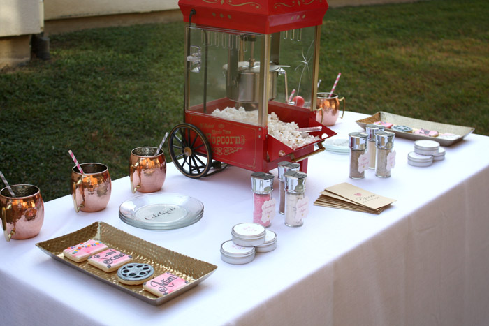It’s a rule; you mustn’t have a party without favors {at least that is my rule}. This is my favorite part of any party. Girls night favors can be a combination of lip gloss, nail polishes, and sweet treats or in this case a mini tin of specialty popcorn salts and sweets to keep with the movie theme.