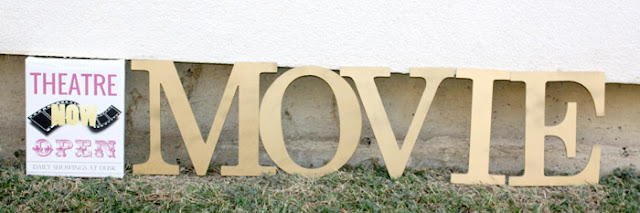 The theatre is now open! Found these large chipboard letters and painted them gold to match our theme. Perfect how they sit behind our popcorn bar.