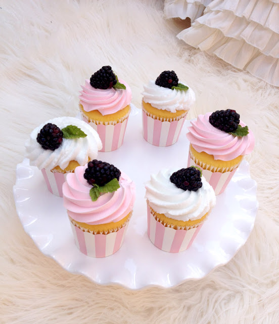 Dressing up store bought cupcakes with blackberries and fresh mint leaves is an easy to way to make them look couture and almost too delectable to eat. ALMOST! Don’t forget to place them on a fancy cake plate or serving tray.