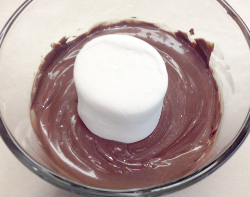 3) Now the fun starts! Take one of the jumbo marshmallows and dip one end into the melted chocolate.